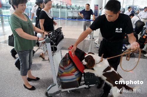 自7月20日始,北京首都機(jī)場、上海虹橋、上海浦東、青島、天津、沈陽、秦皇島,以及新疆維吾爾自治區(qū)、西藏自治區(qū)等19個(gè)機(jī)場實(shí)行特別安檢措施。圖為北京首都國際機(jī)場特檢人員攜警犬上崗執(zhí)勤。中新社發(fā) 陳文 攝