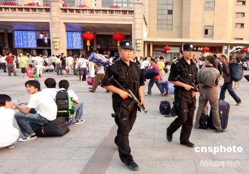 7月22日,特警在北京站廣場巡邏。北京鐵路警方昨日宣布,為確保奧運會安全,鐵路安檢從即日起全面升級,只要進入火車站就要接受各種安檢,其中以前不要求檢查的液體,從現在起也要“過機”。 中新社發 吳芒子 攝