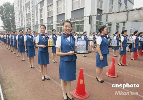 七月二十四日,北京氣溫最高三十四攝氏度。約一千五百名奧運場館貴賓服務志愿者,在操場面帶笑容進行培訓。賽時,該批志愿者將在“鳥巢”、曲棍球場、射箭場和網球中心等四個奧運場館,提供茶點和餐飲食品的售賣服務。中新社發 杜燕 攝