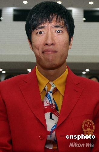 7月25日,參加北京奧運會的中國體育代表團在北京正式成立,長期封閉訓練難得露面的劉翔穿上代表團的全套正裝神態輕松,不改頑皮活潑的本性。 中新社發 任晨鳴 攝