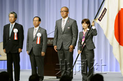 中新網7月29日電 據日本共同社報道,日本奧運代表團成立儀式昨天在東京隆重舉行,擔任選手隊長的柔道男子奧運冠軍鈴木桂治宣誓稱“將抱著爭光的決心,發誓為世界和平作出貢獻”。擔任日本代表團旗手的是19歲的女子乒乓球選手福原愛。她略顯緊張地從代表團團長福田富昭手中接過了巨大的團旗。