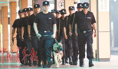 奧運(yùn)會(huì)即將舉辦,突發(fā)事件隨時(shí)可能發(fā)生。為此,上海鐵路警方調(diào)集鐵警精銳進(jìn)駐上海站,并成立了鐵路上海站奧運(yùn)安保前線指揮部。7月以來(lái),鐵路特警全副武裝攜警犬在上海站、車站廣場(chǎng)及與地方接合部晝夜進(jìn)行巡邏檢查。