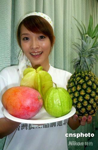 獲選奧運推薦水果的臺灣鳳梨(菠蘿)、楊桃、芭樂(番石榴)、芒果共計10噸,正由島內陸續(xù)運往北京專供奧運村。圖為記者會上,女主持人托著被形容為F4的這四種水果供記者拍照。中新社發(fā) 董會峰 攝