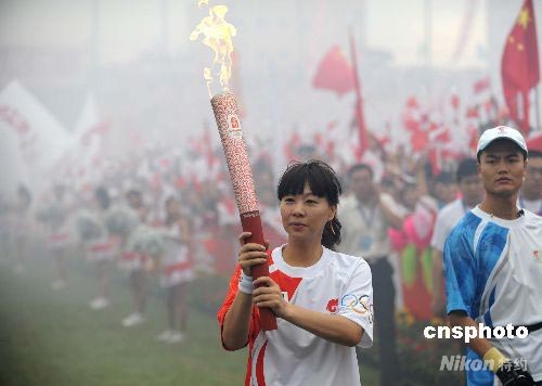 7月31日8點10分,曾獲得30個全國冠軍、51個世界冠軍、第25屆巴塞羅那奧運會女子100米蝶泳冠軍錢紅高舉“祥云”火炬在唐山體育中心主田徑場起跑,北京奧運火炬接力河北省傳遞活動的最后一站——唐山火炬傳遞活動正式開始。中新社發 廖攀 攝