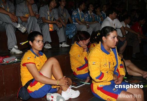 7月31日晚,中國殘疾人藝術團冒雨在北京奧運村表演《我的夢》,吸引不少運動員觀看。圖為哥倫比亞射箭運動員看的津津有味。中新社發 武仲林 攝