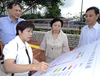 運輸及房屋局局長鄭汝樺(中)到沙田源禾路,視察奧運馬術比賽的交通運輸安排。(圖片來源:香港特區政府網站)