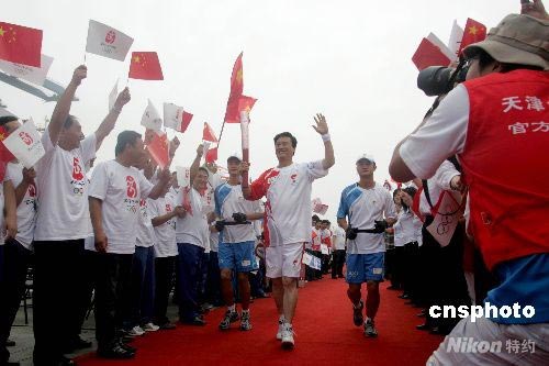 8月1日,奧運火炬在天津濱海新區傳遞,起跑點設在天津港集裝箱碼頭。圖為“藍領專家”孔祥瑞擔任首棒火炬手傳遞奧運火炬。 中新社發 田齊 攝