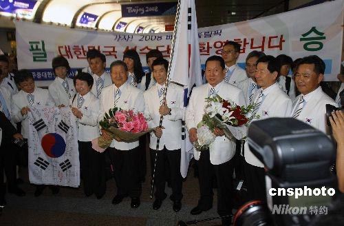 8月1日,由54名官員、教練、運動員組成的首批韓國代表團飛抵北京首都機場。韓國代表團總人數為389名,其中運動員267名,官員、教練等122名。運動員中男運動員160名,女運動員107名,他們當中有七成第一次參加奧運會。 中新社發 劉新 攝