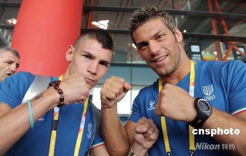 8月1日,即將參加北京奧運會的意大利拳擊手飛抵北京首都國際機(jī)場。圖為意大利拳擊手valentino oomenico(左)與隊友在一起。 中新社發(fā) 陳文 攝