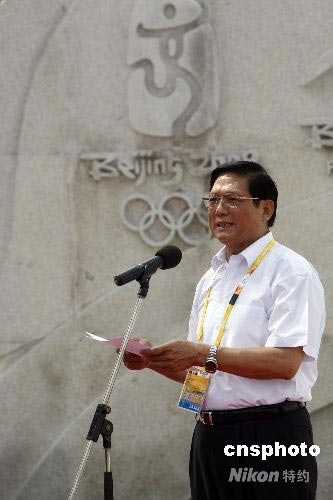 8月1日,北京奧運村“和平友誼墻”正式啟動。圖為北京奧組委主席劉淇在啟動儀式上致詞。中新社發 杜洋 攝