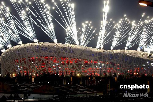 8月2日晚,北京奧運開幕式第二次彩排在國家體育場“鳥巢”舉行。圖為“鳥巢”試放煙花。 中新社發 王東明 攝