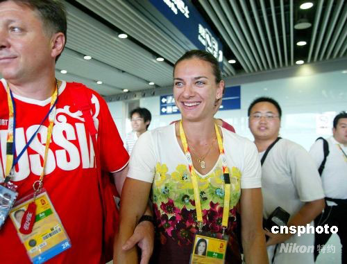 8月3日,俄羅斯著名撐桿跳高運動員伊辛巴耶娃飛抵北京首都國際機場,備戰奧運。 中新社發 富田 攝