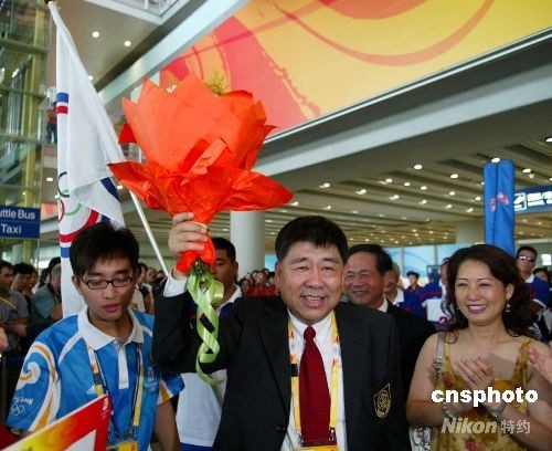 8月3日下午,中華臺(tái)北奧運(yùn)代表團(tuán)一行50人,經(jīng)香港轉(zhuǎn)機(jī)抵達(dá)北京,征戰(zhàn)2008年北京奧運(yùn)會(huì)。圖為代表團(tuán)抵達(dá)北京后,中華臺(tái)北奧運(yùn)代表團(tuán)主席蔡賜爵受到熱烈歡迎。