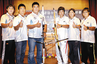 射箭隊男女選手共六人進軍北京奧運,目標鎖定金牌,左起為王正邦、陳詩園、郭振維、袁叔琪、吳蕙如與魏碧銹。 臺灣聯合報圖