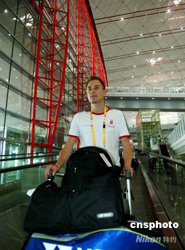 8月3日,丹麥著名羽毛球名將皮特·蓋德飛抵北京首都機場,備戰北京奧運。 中新社發 富田 攝