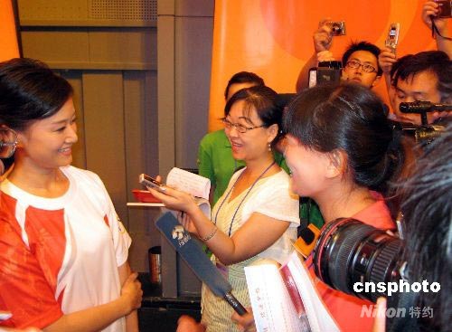 八月四日,奧運火炬北京段傳遞路線和部分火炬手名單公布。中國知名歌唱家宋祖英在首場新聞發(fā)布會上亮相,宣布將擔(dān)任火炬手。宋祖英將出現(xiàn)在八月七日北京地壇火炬?zhèn)鬟f活動現(xiàn)場。在此之前的火炬?zhèn)鬟f活動中,較少出現(xiàn)火炬手提前曝光、與媒體會面的情形。中新社發(fā) 許曉青 攝