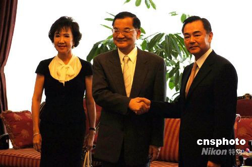 8月5日下午,中國國民黨榮譽(yù)主席連戰(zhàn)夫婦一行抵達(dá)北京首都機(jī)場,將觀禮北京奧運(yùn)開幕式。圖為中共中央臺(tái)辦主任王毅在機(jī)場貴賓室會(huì)見連戰(zhàn)夫婦一行。中新社發(fā) 王東明 攝