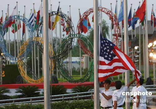 8月5日晚,參加北京奧運(yùn)會的美國代表團(tuán)在北京奧運(yùn)村舉行升旗儀式,奧運(yùn)村村長陳至立等出席。中新社發(fā) 武仲林 攝