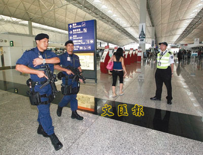 在香港國際機場可以看到,該處的保安已明顯加強,在小范圍內已有多名保安人員執(zhí)勤,而且每行登機柜位都最少有一名保安人員站崗。手持輕機槍的機場特警亦加強巡邏,留意有否發(fā)現(xiàn)可疑物品。有機場內商戶指,從星期天起,機場內保安人手已明顯增加,除擔任日常巡邏外,最近也多了保安人員在定點站崗。