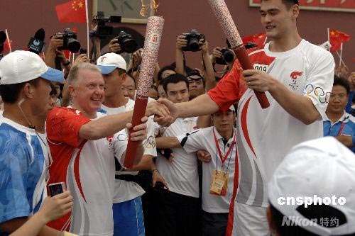 圖為國際奧委會協調委員會主席維爾布魯根與姚明交接火炬。 中新社發 王東明 攝