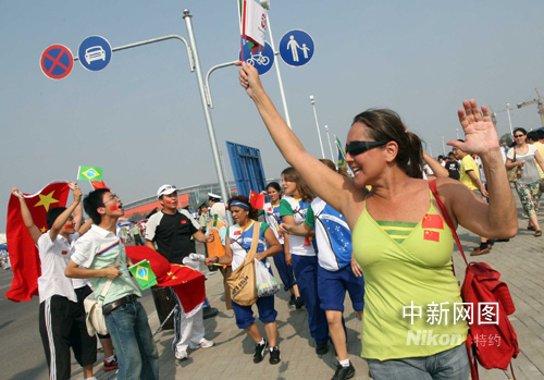 8月7日,巴西、中國球迷在北京奧運沈陽足球分賽場歡呼。當晚,男足巴西對比利時、中國對新西蘭將進行小組賽。中新社發 張宇 攝