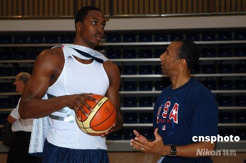 8月7日中午,美國男籃“夢八隊”開始了抵京后的首次訓練。圖為“魔獸”中鋒霍華德與發球教練進行交流。中新社發 賴松 攝