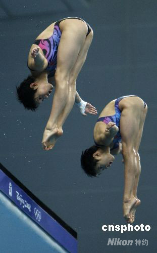 圖為女子雙人10米跳臺跳水組合陳若琳、王鑫“水立方”試水。 中新社發 杜洋 攝