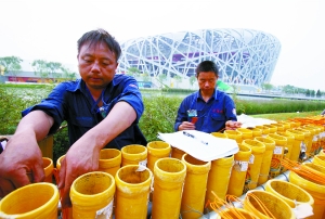 按標準,用于鳥巢燃放的煙花,抽檢率高達50%,即每兩個成品出廠前,其中一個必須當場試放。試放成品過關,另一成品才能裝箱。(記者 王姝)