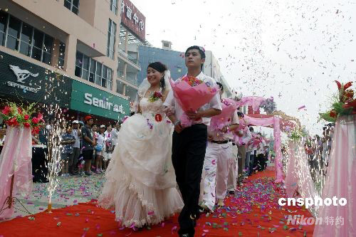 8月8日上午9時,江蘇邳州市十一對新人在市區最繁華的廣場,舉行集體婚禮,喜迎奧運。中新社發 劉向鴻 攝