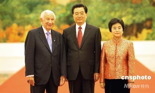 8月8日中午,中國國家主席胡錦濤和夫人劉永清在北京人民大會堂為出席北京奧運會的貴賓舉行歡迎宴會。圖為胡錦濤夫婦歡迎國際奧委會名譽主席薩馬蘭奇。中新社發 任海霞 攝