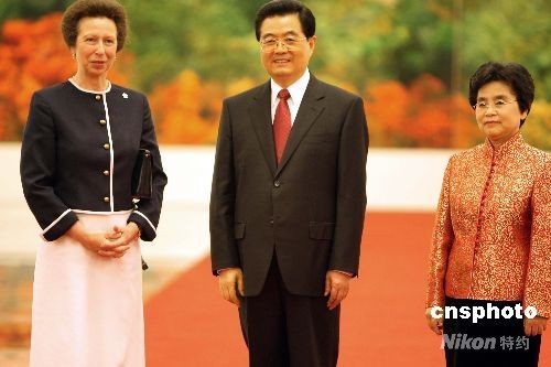 8月8日中午,中國國家主席胡錦濤和夫人劉永清在北京人民大會堂為出席北京奧運會的貴賓舉行歡迎宴會。圖為胡錦濤夫婦歡迎英國安妮公主。中新社發 任海霞 攝