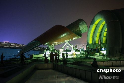 圖為7月23日深夜,鳥巢頂上的奧運火炬塔緩緩走出高度保密的氣房子,準備進行第一次試點火。中新社發 佟偉 攝
