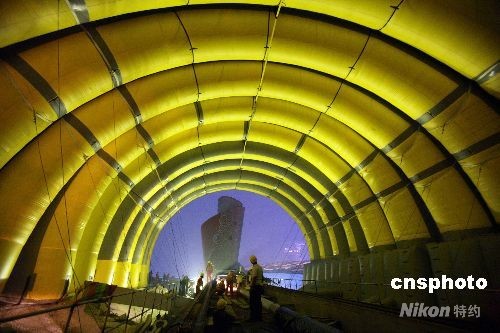 圖為7月23日深夜,鳥巢頂上的奧運火炬塔緩緩走出高度保密的氣房子,準備進行第一次試點火。中新社發 佟偉 攝