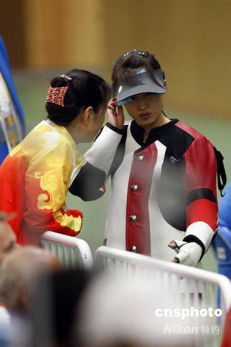 8月9日,北京奧運會開賽的第一天,女子10米氣步槍資格賽率先在北京射擊館拉開戰幕。30多個國家的47名選手在17到63號靶位比試槍法;資格賽前八名進入最后決賽。中國選手趙穎慧只打出389環未能晉級決賽。圖為趙穎慧在請教教練。 中新社發 盛佳鵬 攝