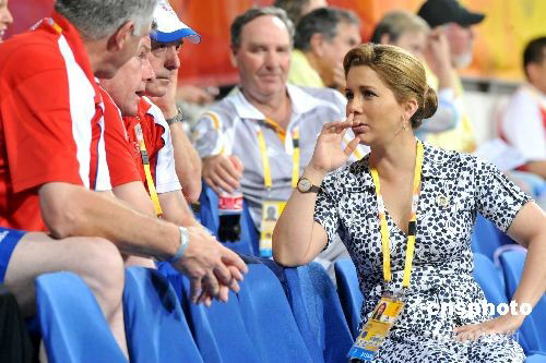 八月九日晚,北京奧運馬術項目在香港沙田賽場舉行盛裝舞步賽事,國際馬術聯合會主席、約旦公主哈雅到場觀賽,并與參賽隊伍職員在看臺上交談。中新社發(fā) 鄧慶樂 攝