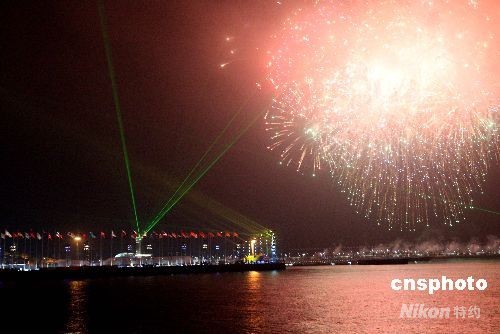 第29屆奧林匹運動會帆船比賽啟動儀式8月9日晚在青島舉行,絢麗多彩的煙花映亮奧帆中心。中新社發 趙振清 攝