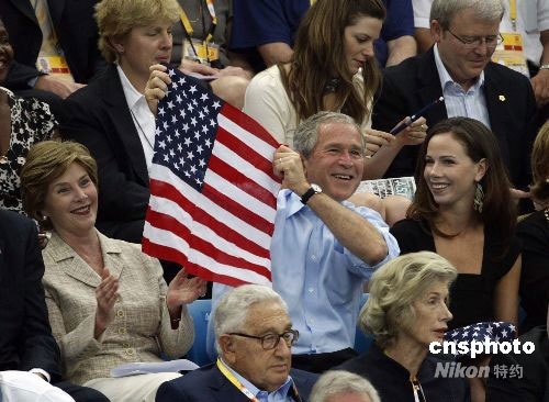 圖:布什、陸克文“水立方”觀戰(zhàn) 為自家選手助陣