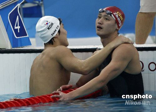 8月10日,北京奧運(yùn)會(huì)游泳項(xiàng)目男子400米自由泳決賽上午在水立方舉行,韓國(guó)選手樸泰桓以3分41秒86獲得金牌,中國(guó)選手張琳(右)以3分42秒44獲得銀牌,圖為二人互相致賀。中新社發(fā) 杜洋 攝