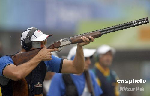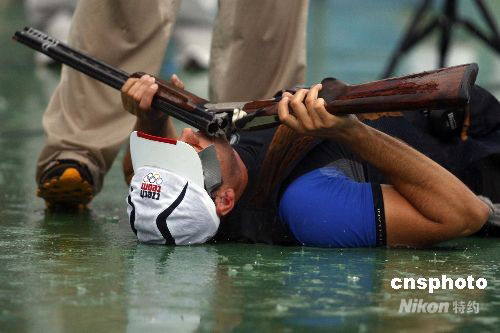 8月10日,2008年北京奧運會進入第二個比賽日,在男子飛碟多向決賽中,捷克選手科斯特萊茨基以146中的成績奪取金牌,這也是捷克代表團在北京奧運會上所贏得的第二枚金牌。 中新社發 盛佳鵬 攝