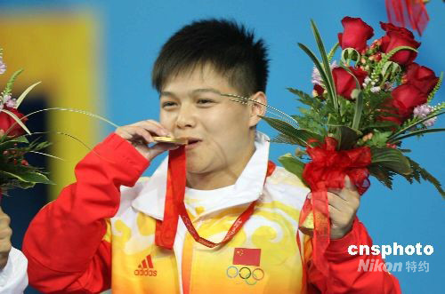 8月10日,17歲的中國小將龍清泉在北京奧運會男子56公斤級舉重比賽中,以總成績292公斤奪得冠軍。頒獎式上,龍清泉幸福體會“金牌滋味”。 中新社發 武仲林 攝