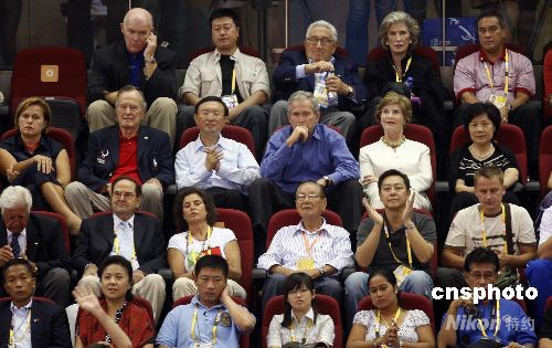 8月10日晚,北京奧運(yùn)會(huì)男子籃球中國隊(duì)與美國“夢(mèng)八隊(duì)”之戰(zhàn)在五棵松籃球館舉行,美國總統(tǒng)布什夫婦、老布什夫婦在中國外長楊潔篪陪同下與爆滿的觀眾共同觀看比賽。 中新社發(fā) 盛佳鵬 攝