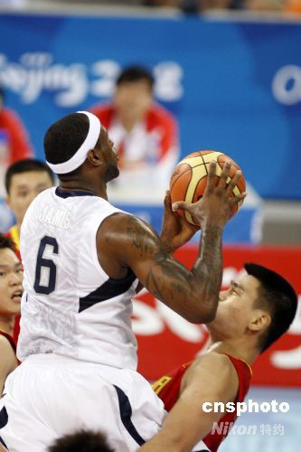 8月10日,奧運(yùn)男子籃球比賽中國(guó)男籃與美國(guó)男籃在北京五棵松籃球館正式開打,圖為美國(guó)6號(hào)隊(duì)員詹姆斯“攻克”姚明的防守。 中新社發(fā) 盛佳鵬 攝