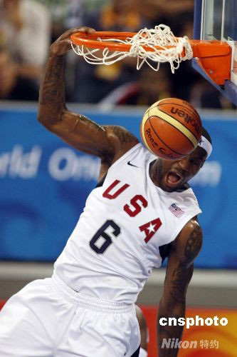 8月10日,奧運男子籃球比賽中國男籃與美國男籃的比賽在北京五棵松籃球館正式開打。圖為美國6號隊員“小皇帝”詹姆斯飛身扣籃。中新社發 盛佳鵬 攝