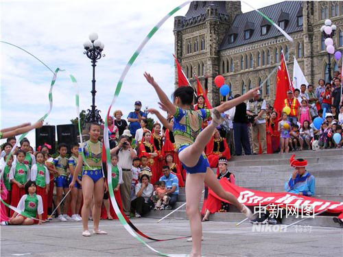 接下來的文藝演出精彩紛呈,加拿大朋友表演獨唱、合唱和民族舞蹈,尤其是武術(shù)表演更受到大家的歡迎。來自杭州青少年文化中心藝術(shù)體操隊的小演員們則表演了精彩的藝術(shù)體操。