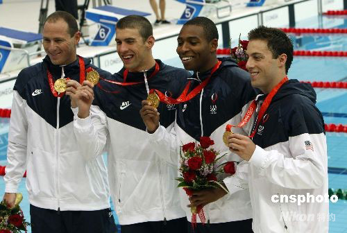 8月11日,美國隊奪得北京奧運會男子4x100米自由泳接力金牌,并打破該項目世界紀錄。  中新社發 杜洋 攝