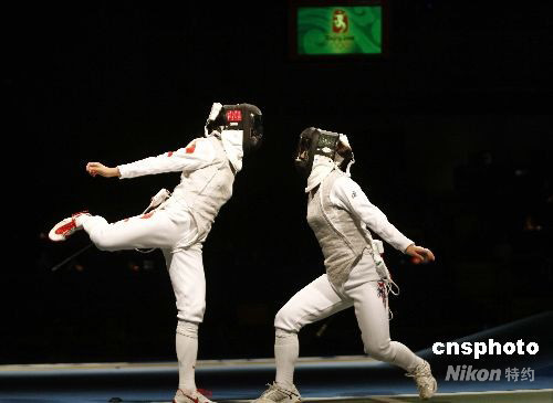 8月11日,北京奧運會女子花劍個人1/16決賽在北京國際會議中心擊劍館舉行,中國選手蘇婉文(左)以15:7戰勝美國選手埃米莉·克羅斯,成功晉級。圖為 雙方在場上拼殺的動作頗似芭蕾舞蹈。中新社發 盛佳鵬 攝