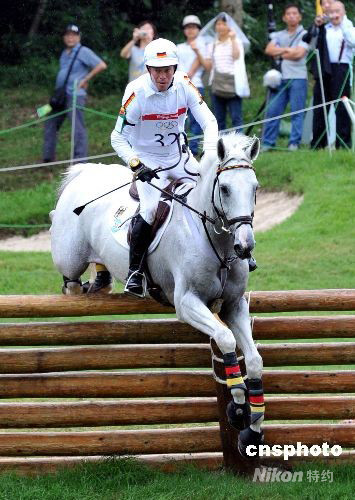八月十一日,北京奧運馬術三項賽個人賽之越野賽在香港上水雙魚河舉行,結果德國選手欣里希·彼得·羅邁克在盛裝舞步賽及越野賽后暫時在績分上領先。圖為他與坐騎“馬里烏斯·福格特”在越野賽上成功飛躍跨欄。 中新社發 鄧慶樂 攝