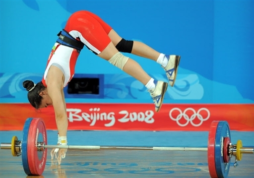 8月11日,阿爾巴尼亞選手羅梅拉·貝加伊試舉成功后興奮地翻起筋斗。當(dāng)日,北京奧運會舉重女子58公斤級決賽在北京航空航天大學(xué)體育館舉行。