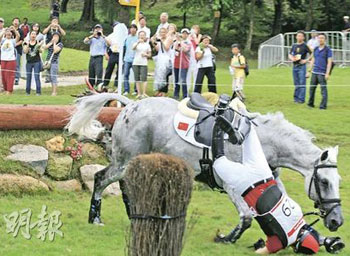 奧運馬術三項賽的越野障礙賽11日早8時在上水雙魚河舉行,吸引近1萬名觀眾入場。其中,中國首名參加奧馬的18歲選手華天,在日前盛裝舞步賽環節中排名31,成績緊隨三項賽六朝元老托德之后。但11日越野賽中,華天跨越于8號“雨花臺”障礙欄時,他策騎的馬“武松”前腳碰到障礙物,馬失前蹄,華天被拋落地面。