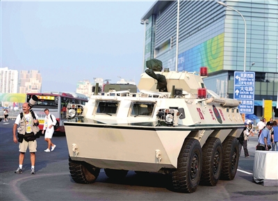 裝甲車停在奧運主新聞中心安檢口。范繼文攝